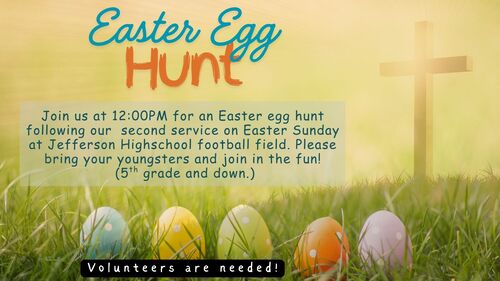 Join us for an Easter egg hunt following our 10:00 AM service on Easter Sunday, at the Jefferson High School football field. Please bring your youngsters and join in the fun! (5th grade and down)