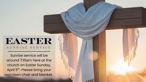 Sunrise service will be held around 7:10am here at the church on Easter Sunday, April 5th. Please bring your own lawn chair and blanket.