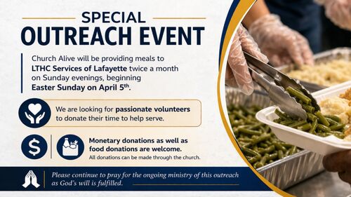 Church Alive will be providing meals to LTHC Services of Lafayette twice a month on Sunday evenings, beginning Easter Sunday on April 5th. We are looking for passionate volunteers to donate their time to help serve. Monetary donations as well as food donations are welcome. All donations can be made through the church. Please continue to pray for the ongoing ministry of this outreach as God's will is fulfilled.