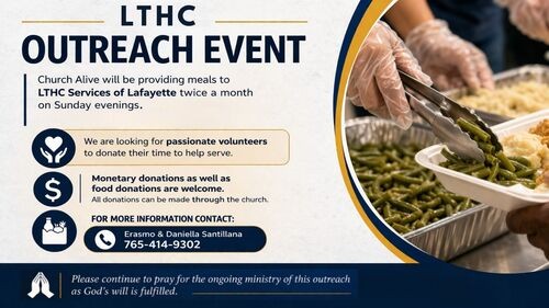 Church Alive will be providing meals to LTHC Services of Lafayette twice a month on Sunday evenings. We are looking for passionate volunteers to donate their time to help serve. Monetary donations as well as food donations are welcome. All donations can be made through the church. Please continue to pray for the ongoing ministry of this outreach as God's will is fulfilled. For more information, please contact Erasmo & Daniella Santillana at 765-414-6302.