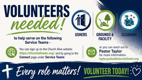 We are currently seeking volunteers to serve on several important Service Teams, including Ushers, Grounds & Facility, and Cleaning. If you’re looking for a way to get involved and make a difference, this is a great opportunity to serve your church community. You can sign up by visiting the Church Alive website at https://churchalivewc.org/ and navigating to the Connect page under Service Teams, or you can reach out directly to Pastor Taylor for more information. Every role matters, and your willingness to serve makes an impact—volunteer today!