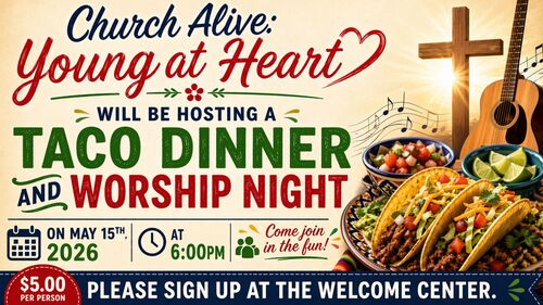 Young at Heart will be hosting a Taco Dinner and Worship Night here at the church on May 15th, 2026, at 6:00pm. Come join in the fun! $5.00 per person. Please sign up at the Welcome Center.