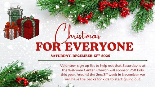 Christmas for Everyone will be held on Saturday, December 13th, 2025. The volunteer sign-up list to help out that Saturday is at the Welcome Center. Church will sponsor 250 kids this year. Around the 2nd/3rd week in November, we will have the packs for kids to start giving out.
