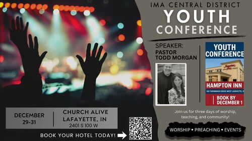 IMA Youth Conference will be held at Church Alive on December 29th - 31st. Pastor Todd Morgan will be speaking. Join us for three days of worship, teaching, and community! Hotel reservations can be placed by scanning the QR Code. Rooms need to be booked by December 1st. Hope to see you there!