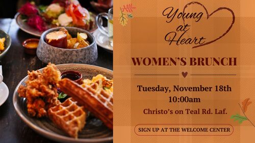 Join the ladies of the Young at Heart for delicious food and fellowship on Tuesday, November 18th at Christo's on Teal Rd. Laf. at 10:00am. Please sign up at the welcome center.
