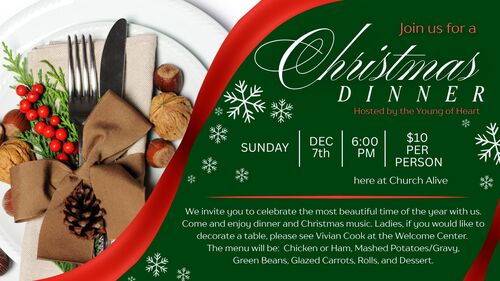 Will be held Sunday, December 7th, 2025, at 6:00pm, here at the church. Cost is $10/per person. We invite you to celebrate the most beautiful time of the year with us. Come and enjoy dinner and Christmas music. Ladies, if you would like to decorate a table, please see Vivian Cook at the Welcome Center. The menu will be: Chicken or Ham, Mashed Potatoes/Gravy, Green Beans, Glazed Carrots, Rolls, Dessert.