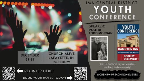 IMA Youth Conference will be held at Church Alive on December 29th - 31st. Pastor Todd Morgan will be speaking. Join us for three days of worship, teaching, and community! Registration for Conference will be available ASAP!! Hotel reservations can be placed by scanning the QR Code. Rooms need to be booked by December 1st. Hope to see you there!