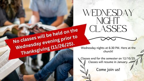 Come join us at 6:30pm on Wednesday nights, here at the church! SOKM begins at 6:00pm. Study, learn, fellowship, and enjoy!! Childcare is provided. ***No classes will be held on the Wednesday evening prior to Thanksgiving (11/26/25). Classes end for the semester on 12/10/25. Classes will resume in January.