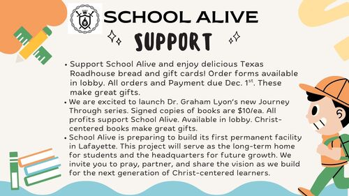 *School Alive is preparing to build its first permanent facility in Lafayette. This project will serve as the long-term home for students and the headquarters for future growth. We invite you to pray, partner, and share the vision as we build for the next generation of Christ-centered learners.