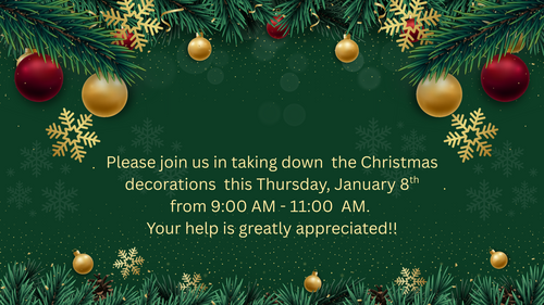 Please join us in taking down the Christmas decorations this Thursday, January 8th from 9:00 AM - 11:00 AM. Your help is greatly appreciated!