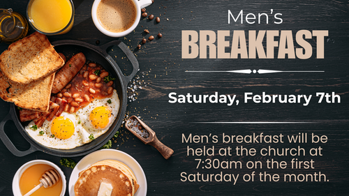 Men's Breakfast will be held at the church at 7:30am on the first Saturdayo of the month. Please join us for food and fellowship on Saturday, February 7th!