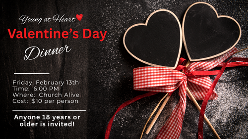 The Young at Heart is hosting a Valentine's Day Dinner here at the church on Friday, February 13th at 6:00 PM. Cost is $10 per person. Anyone 18 years or older is invited to attend.